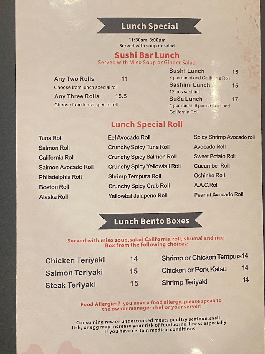 Shrimp or chicken lightly battered, served in bento with rice, miso soup, salad, and fruit.