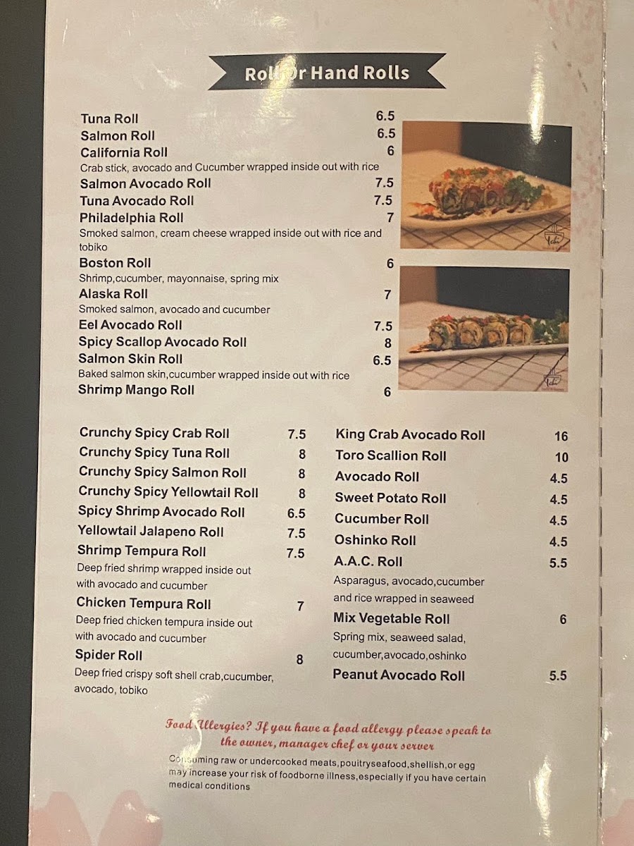 Tuna and avocado wrapped in seaweed, available as roll or hand roll.